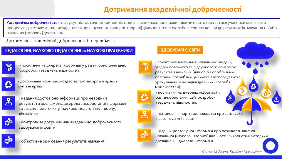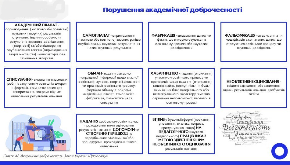 Відповідно до статті 42 Закону України «Про освіту» академічна доброчесність – це сукупність етичних принципів та визначених законом правил, якими мають керуватися учасники освітнього процесу під час навчання, викладання та провадження наукової (творчої) діяльності з метою забезпечення довіри до результатів навчання та/або наукових (творчих) досягнень.