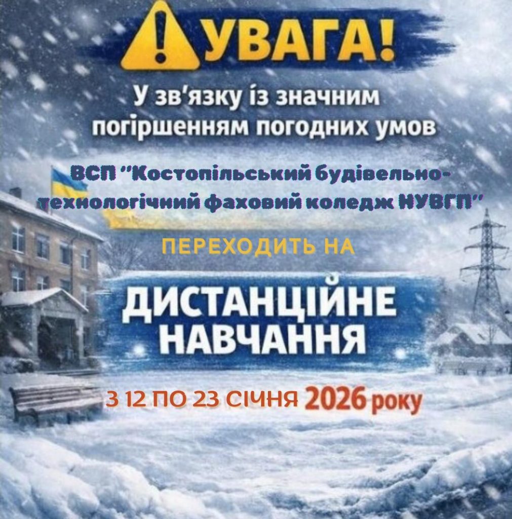Увага! У зв’язку з погіршенням погодніх умов, навчання з 12.01.26 по 23.01.26 буде відбуватись дистанційно
