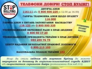 Гаряча телефонна лінія щодо булінгу 116 000;